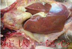 四、剖检变化:在心脏及肝上将有不同程度包有白色或黄色的干酪样分泌物。