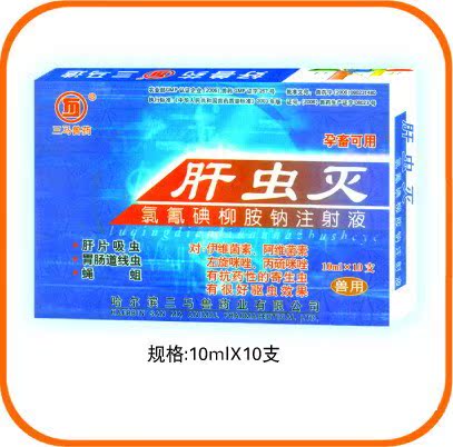 肝虫灭---防治牛、羊肝片吸虫病 注射一次 孕畜可用 主要成分:氯氰碘胺钠 作用与用途:驱虫药。对肝片吸虫、胃肠道线虫及节肢动物的幼虫阶段有驱杀活性。主要用于防治牛、羊肝片吸虫病。胃肠道线虫病及羊狂蝇蛆病等。对猪、犬、马等动物体内外的各种寄生虫,如胃肠道的各种线虫,体表的疥螨,血虱等驱虫效果非常明显。 用法与用量:皮下或肌内 注 射,一次量每1kg体重,牛0.05-0.1ml,羊、犬0.1-0.2ml,猪、马皮下注 射,每1kg体重0.05ml 规格:10ml:0.5g 包装:10mlx10支/盒x30盒/箱 生产企业:哈尔滨三马兽药有限公司 |
