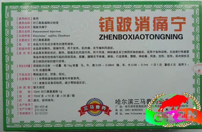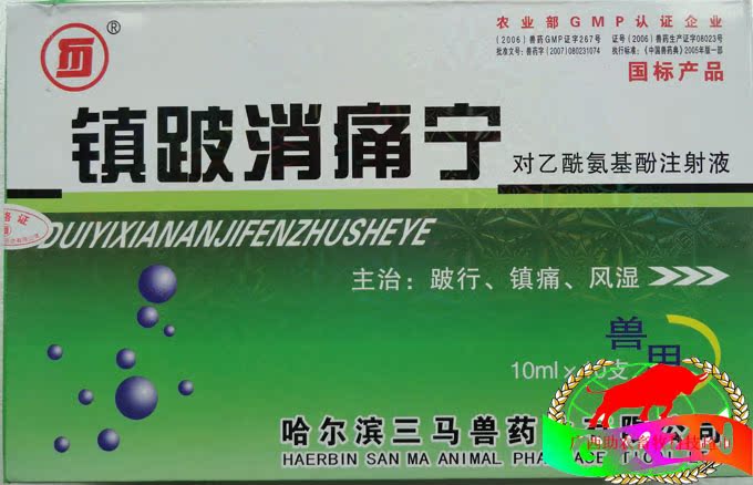 【商品名称】镇跛消痛宁 【通用名称】对乙酰氨基酚水剂 【主要成分】对乙酰氨基酚 【性 状】本品为无色或淡黄色的澄明液体 【药理作用】本品具有解热、镇痛作用。用于发热、肌肉痛、关节痛和风湿症 【适应症 】本品具有高效消炎、解热,镇痛及抗风湿作用。用于风湿、神经痛及他病因所致的跛症。适用于各种动物。主治流行性感冒等各种高热性疾病引起的四肢屈曲,筋腱、腱鞘关节疼痛,肿胀,行走困难,震颤、神经痛、风湿、创伤、扭伤、肌肉损伤及其他病因所致的跛行症等。 【用法用量】深部肌肉注射一次量 每1kg体重 马、牛、鹿0.05-0.08ml 猪、羊、犬0.06-0.1ml 1日1次重症2次 连用3-5天或遵医嘱 【不良反应】胃肠反应,厌食,呕吐 【注意事项】(1)有胃肠道疾病的患畜和孕畜禁用。 (2)患畜应采食后给药,减少胃肠道反应。 【休药期】暂无规定 【规 格】10ml:对乙酰氨基酚1g 【包 装】10ml/支*10支/盒*30盒/箱 【贮 藏】遮光、密闭保存。 |