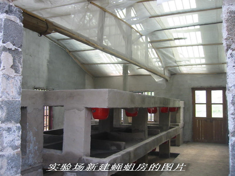 实验场新蝇蛆房的建设图片,蝇蛆房加大了育蛆池的面积,每个育蛆池由现在的0.7平方米增加到1-1.3平方米,改进了透光材料,采用玻璃瓦,改进了收蛆桶的自动分离坡度。改进后,粪料进入收蛆桶的量会显著减少