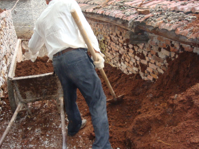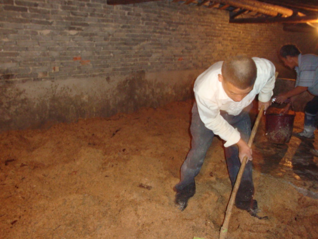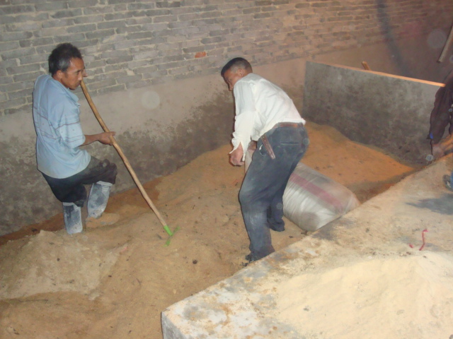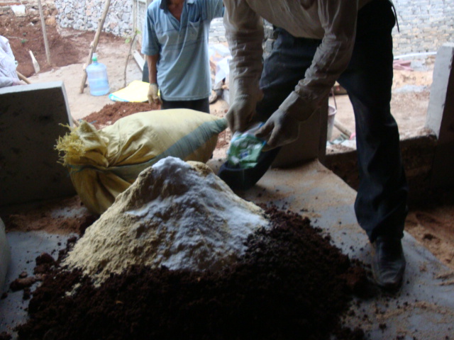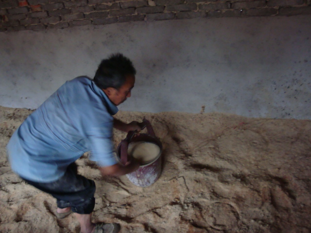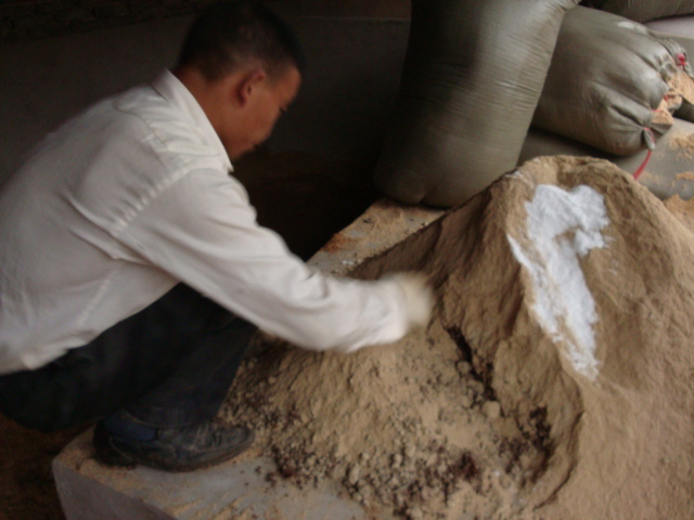 黄土100斤、玉米粉5斤、米糠200斤食盐6斤拌匀