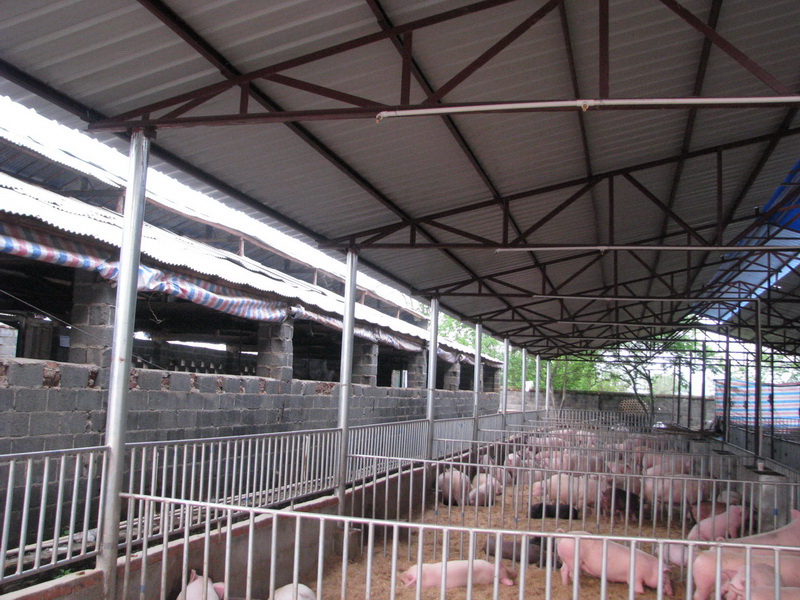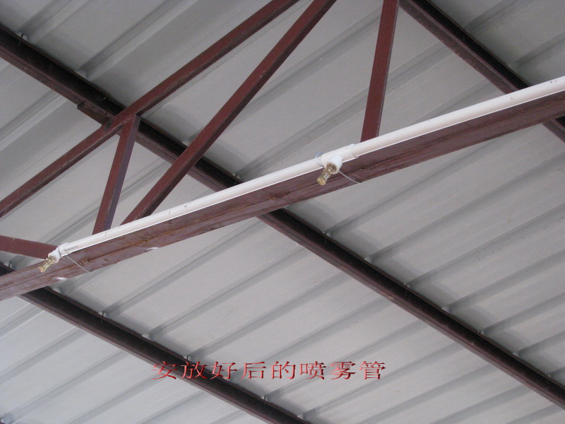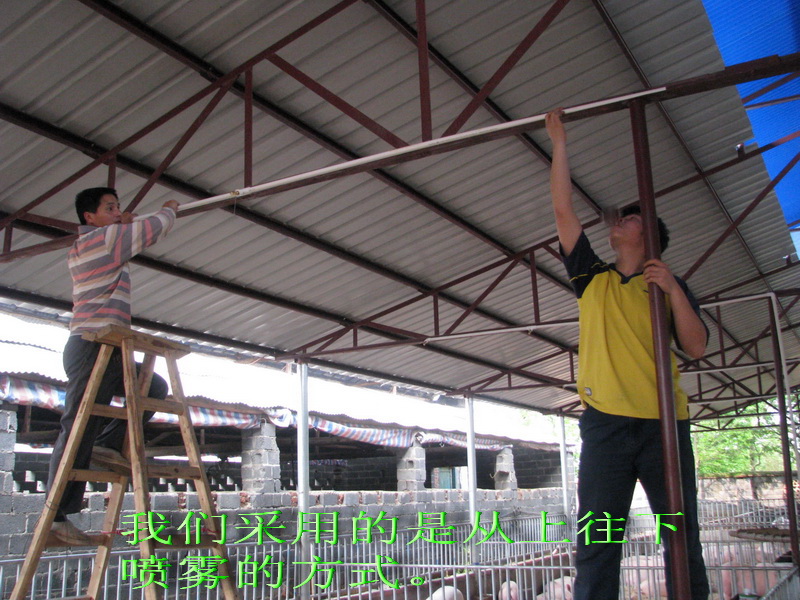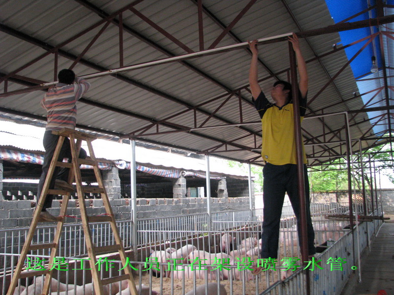 我们把昨天购买的喷雾材料,经过测量、计算、裁接、组装、并安装完毕!在安装的时侯受到了猪只热烈的欢迎,不断的来亲吻工作人员与楼梯!我们在每个栏舍前面都安装了一个阀门开关,这样利于了饲养员的操作与管理。喷雾头安放时调整成了一定的角度,喷雾效果更好!安装完毕后我们找来了以前用来人工喷雾的高压水枪增压泵,用于测试喷雾管的连接有无问题和喷雾头的喷雾效果。喷雾器开启后猪只显得特别兴奋,“乐不思蜀”有的围绕着栏舍奔跑,有的跑到雾下享受着我们这份幸苦的“汗水”!感到非常的“幸福快乐”!