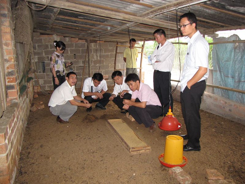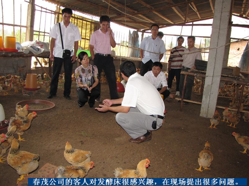 今天天公不作美,一直下着小雨,早上10点左右,春茂公司的骨干一行5人来到养殖场,服务部的负责人蒋爱国亲自在农场接待,首先大家到发酵床养鸡现场参观,在养鸡现场,春茂公司的客人很惊奇,在养鸡场几乎是闻不到一点臭味,鸡的长势很好,毛色漂亮,其中的一位客人,是春茂公司的技术员,在鸡栏里抓了几只鸡看了看屁股和脚掌,然后点点头说这鸡很好。在