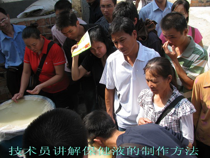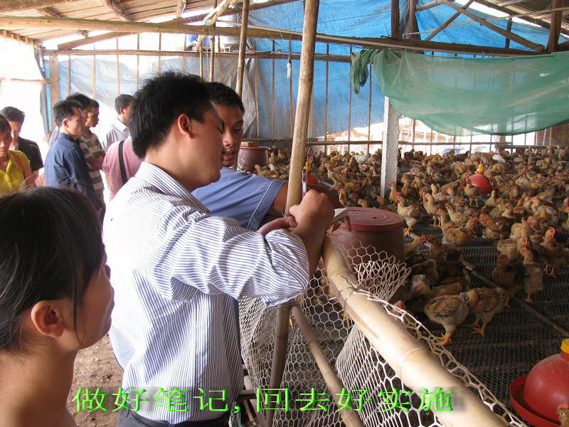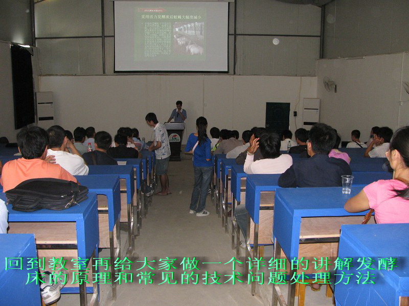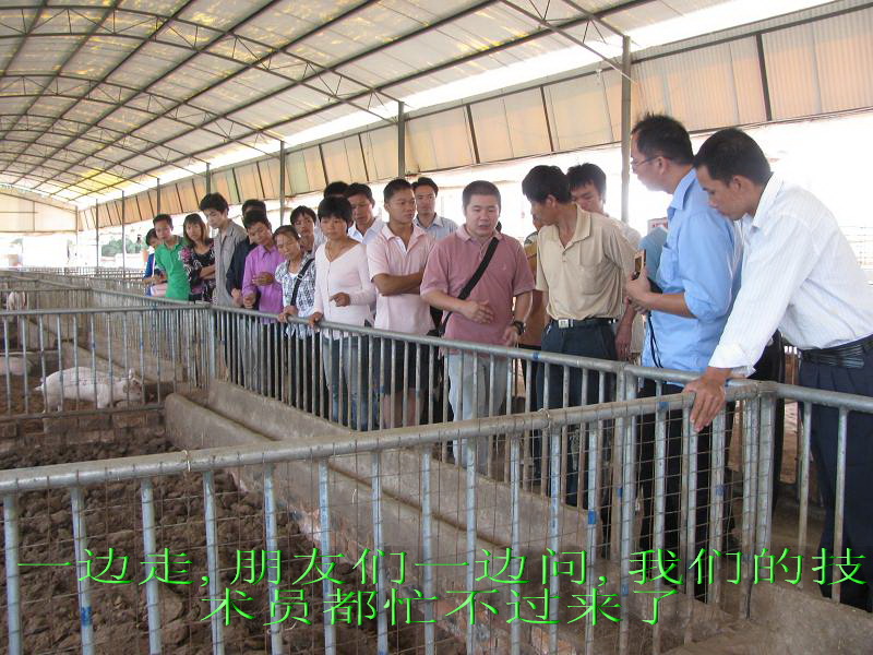 为什么能达到这种没有臭味的效果呢?有着这么多问题.我们技术员就站到发酵床上给大家做一个详细的解说.经过我们技术员的解说,大部分的问题都得到解答.技术员说完了以后,就开始参观另外一栋简单建造成本低廉的发酵床.环保卫生,造价低廉,取材方便引起不少朋友关注.在参观的人群中有一名自深圳的朋友,在深圳养殖有100头母猪,因为养猪不环保被迫搬迁了,从网上了解到我们的发酵床后,特地坐飞机赶过来参观学习.并一直跟着我们技术员不断地提问问题.最后觉得我们的发酵床确实可行,同时他有一个2万人的工厂,每天有好多的潲水,现在是煮熟来喂猪,不但需要的人多,柴火等开支也不少,且有很多苍蝇,臭味非常难闻环保部门经常上门.我们技术员在讲解木薯渣发酵罐的时候,也说了,这个罐不仅仅能发酵木薯渣,同时发酵豆渣或者潲水也可以使用,这时候他非常高兴,这次真的学到东西了,这套技术用到他的养殖场上,将节省大量的人工和柴火了.最后到我们门面购买了菌种回去试验扩建发展环保养殖.