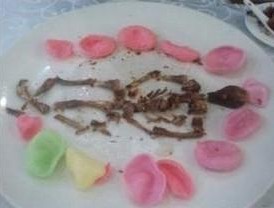 据她介绍,本月2日她与王迅教授一起去吃饭,点了一只鸡、一盘麻豆腐和两碗米饭。教授边吃边用鸡骨头在盘子里拼出一具“人骨”,用虾片围成一圈装饰,摆得差不多了对她说“照个相吧”,她便用手机照下了教授为它“痛哭”、向它敬礼鞠躬的照片,还录了他唱国际歌的视频。“两个服务员一直在旁边看,笑了半天了。那个服务员小后生,用手机照了好几张,还不让那个女服务员收盘子,还要照!”