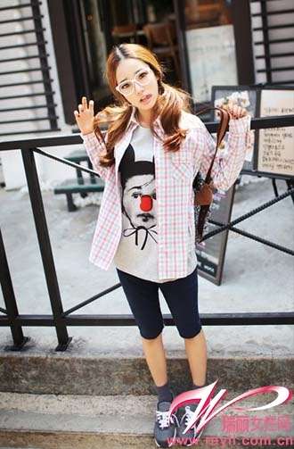 个性图案灰色T搭配黑色五分裤和粉色格纹衬衫
