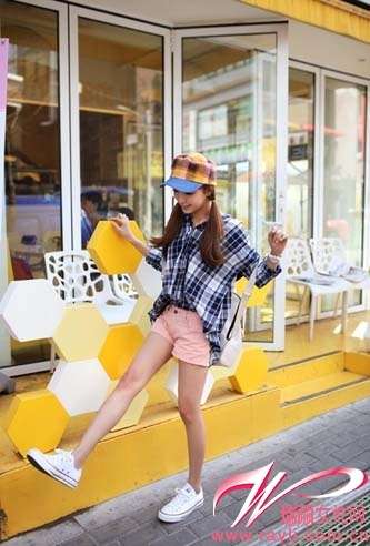 宽松格纹衬衫搭配可爱的粉色短裤和棒球帽