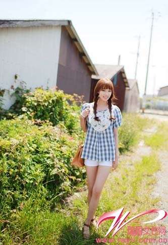 七分袖格纹衬衫搭配牛仔短裤,宽腰带做点缀