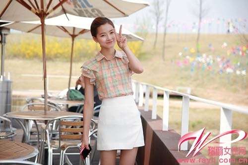 前胸带有蕾丝装饰的格纹短袖上衣搭配白色短裤