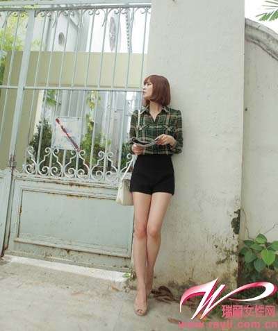 绿色系透视感格纹衬衫搭配黑色A字型短裤和裸色鱼嘴高跟鞋