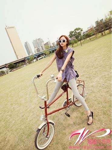 boyfriend风格纹宽松无袖衫搭配裸色系紧腿裤
