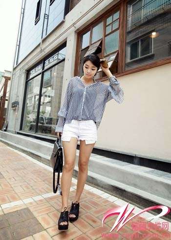 透视感黑白格纹衬衫搭配白色牛仔短裤