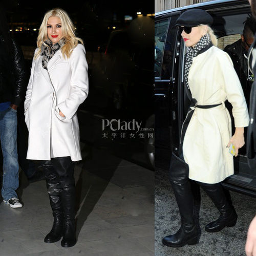 同样是辣妈,Gwen stefani对过膝长筒靴同样钟爱有嘉,近日在巴黎逗留期间,频频以过膝靴亮相,与可儿不同的是,这位有着朋克情节的摇滚歌手钟爱的是低跟款,与白色外套配搭,外套和靴子完整接合,黑白配搭,加大标志性的性感红唇卷发,优雅非常。