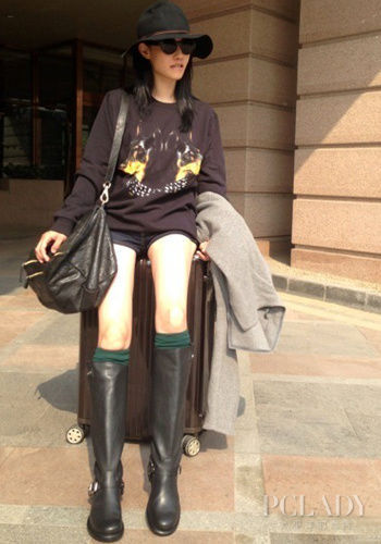 白百何私搭及膝长靴,宽松的套头卫衣搭配超短热裤,在渐凉的秋日不仅有型也起到了保暖的作用。平底长靴内搭长筒袜让整体搭配更富有层次感,墨镜和黑色礼帽简单又不失时尚感的单品为整身衣着增添不羁色彩。